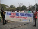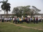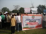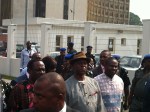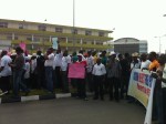 Police directed protestors into the parking lot first and then back outside the entrance as they waited for the address of the Governor of Rivers State, Chibuike Amaechi. The governor spoke for twenty minutes on the importance of having affordable fuel and promised to speak with President Jonathan promptly after the demonstration. He always wanted to dispel the rumor that the President had left the country; he stated that he had just spoke with the President on the phone at 1 am. The Governor and the President do not historically have a harmonious relationship so some of the protestors around me wondered aloud how the two were negotiating during the crisis. Before ending his speech he also asked, using the term “beg,” that the national strike be ended as soon as possible, a suggestion that we met with jeers by the crowd. When he left his stage the protesters simply dispersed, guided along by the strong police presence.
