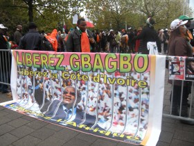 I spent an hour or so talking with various protesters. Although a good number lived in the Netherlands, most seemed to have come from all over Western Europe, telling me they spent the night on buses from London, Paris, Berlin, and Milan to attend and would turn around and get back on the bus that same afternoon. I heard a litany of reasons for their presence there, with the most simple being that Gbagbo was a family friend or that he was born in the same community as the protester. Some said they came out because they felt he would be a better ruler than Outtara, while others felt he had been a scapegoat for an out-of-control military that acted of its own accord. Many voiced anger that Gbagbo’s inner circle have all been imprisoned under Outtara, including the former First Lady Simone Hehivet Gbagbo, his son, Michel Gbagbo, and former Prime Minister Pascal Affi N’Guessan. Many chanted about one-sided justice, in which both sides had committed violence yet only Gbagbo was arrested. I was handed a leaflet calling the 2010 election a France-backed coup, a form of neocolonialism. A different leaflet I received showed graphic photos of dead bodies from a massacre that allegedly occurred on July 20, 2012, captions stating that Ouattara used the military to burn opponents alive and that he had established concentration camps. Another Ivorian-French man at the rally gave me an information sheet that had nothing to do with the 2010 election violence at all, but rather was demanding an answer as to who was responsible for the November 2004 bombing of a French military camp in Bouaké, which killed 9 French soldiers, one American civilian, and injured 38 others. The pro-Gbagbo demonstration simply gave him an audience and platform he needed to get his message across.