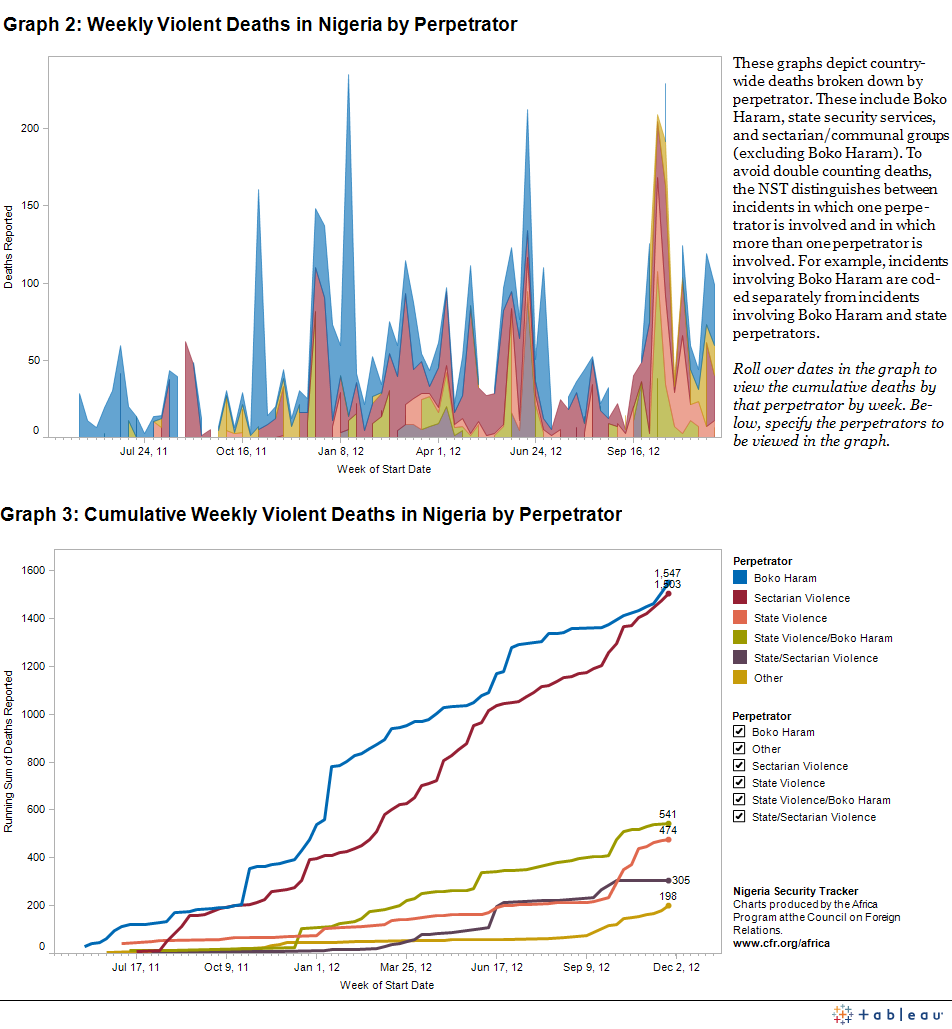 This database on violence is the only one I know of that was updated weekly and the interactive maps on the website can be broken down by state, a feature particularly important when looking at Boko Haram’s geographic patterns. For 2012:
