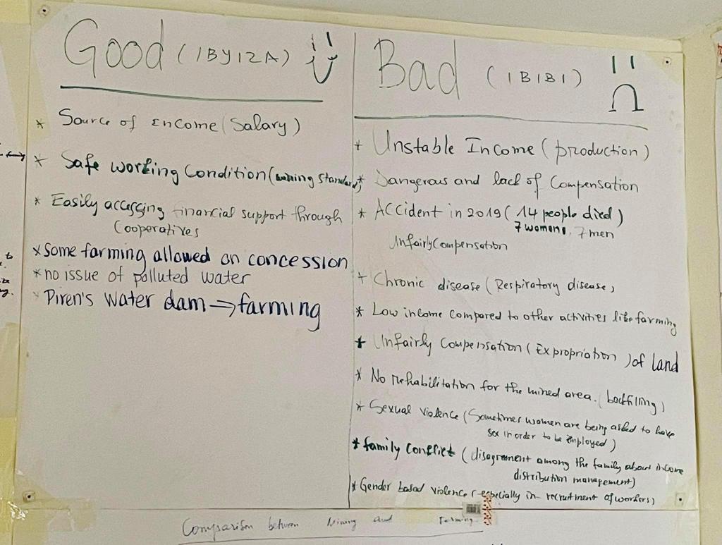 Indeed, legal mining sponsored by state-recognized companies creates rules that keep women physically safe, introduces gender quotas or laws that ensure more equitable incomes, and instills a culture of lawfulness. Direct violence may be less likely in legal mining operations. At this time though, the avenues for remedying a wrong are more nebulous and less accessible for women working for an official company. They do not know the private security guards to whom they are revealing private information. They don’t feel confident telling a foreign supervisor about incidents when that supervisor may not speak Kinyarwanda well. They do not understand the HR structures for elevating a complaint at a mining company office.
